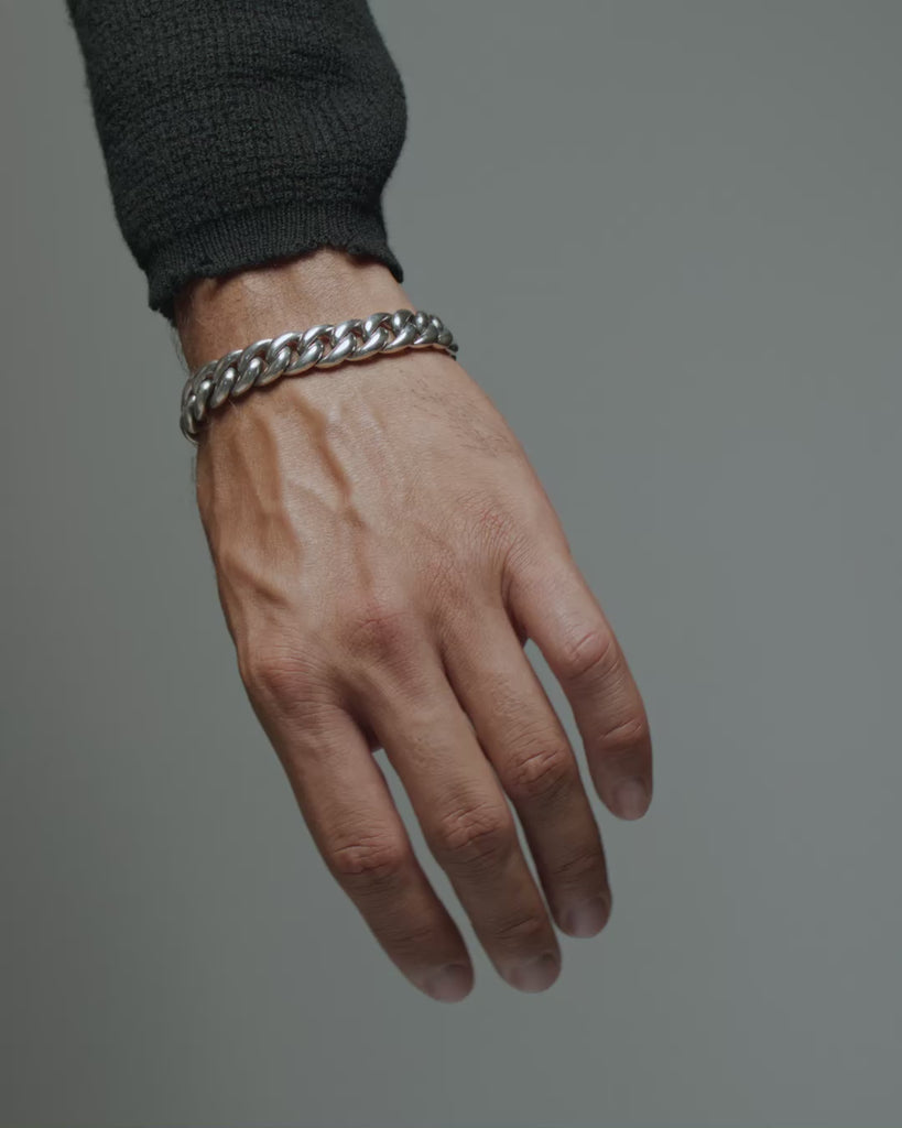Here’s our version of the classic Box & Tongue, so called as the two parts of the clasp resemble a tongue that slides into a box. The links are basically a lower profile version of our Model 10 curb links so you know they flow. But the real magic is in this beautiful mechanism. Construction is entirely by hand and fine tuned with file and experience. The tongue is folded and hand-sprung. And as for the safety, well we don’t need one because our clasp works as promised.
